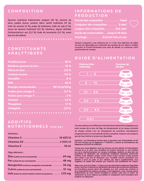 Une alimentation complète et ciblée pour les chiens sensibles, formulée pour prendre soin de la peau, sublimer le pelage et limiter les réactions alimentaires.