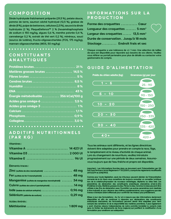 Une recette fonctionnelle spécialement développée pour prendre soin des dents et des gencives de votre chien au quotidien, tout en favorisant une haleine fraîche et une excellente tolérance digestive.